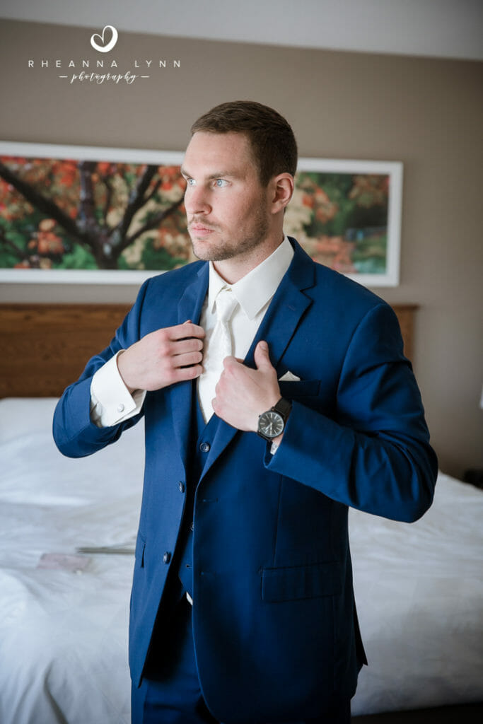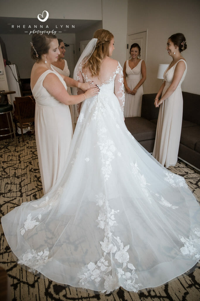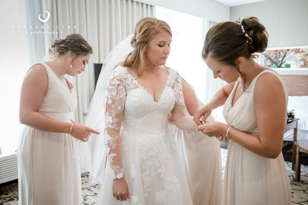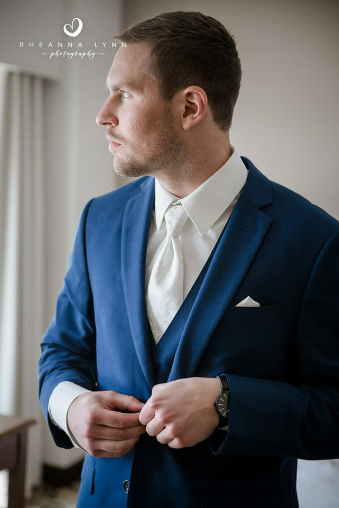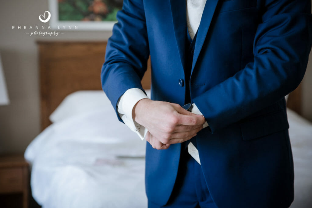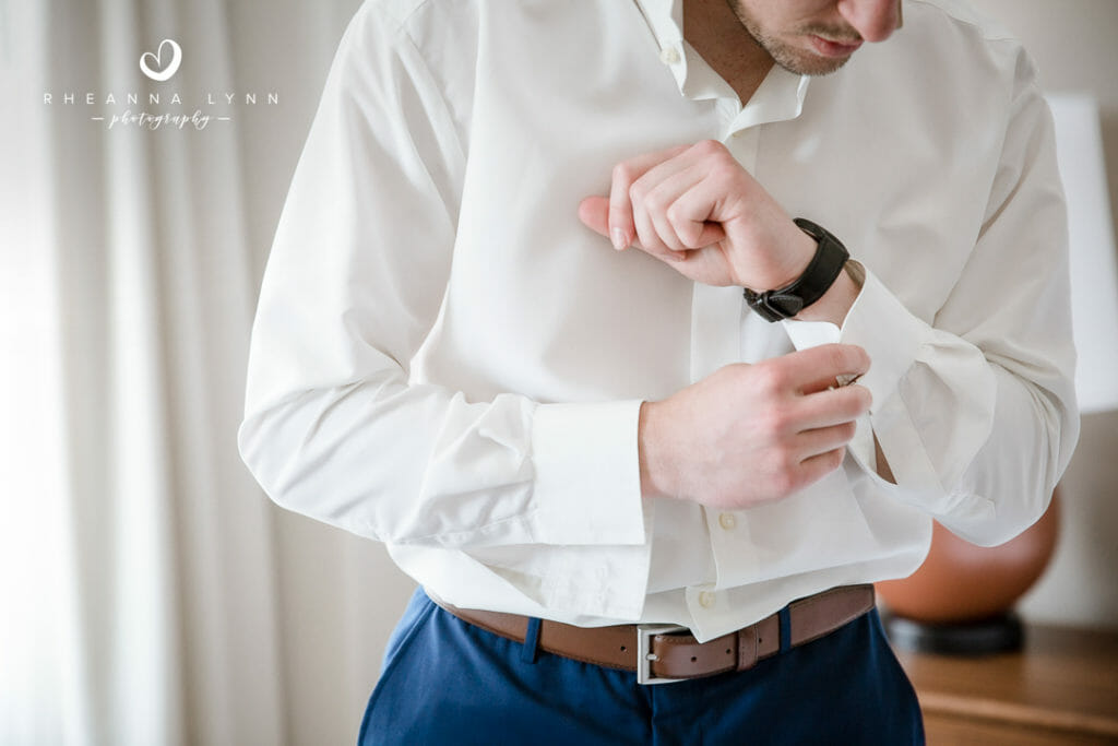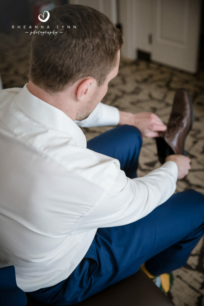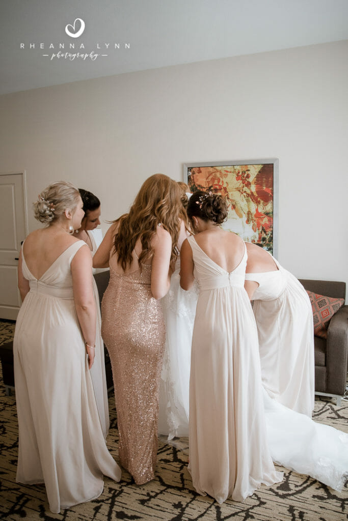 Their day arrived and it couldn’t have been more beautiful! It was a perfect summer day with big blue skies above us; not too hot, not too humid. I started off at the Holiday Inn where the ladies were busy getting ready. A few of the girls were finishing up at the salon around the corner as Karina was working on her final touches. I worked on the carefully selected details for their day as the ladies giggled in the background. I made it over to the guys, (whom were lookin’ so dapper in their blue suits) to capture Logan’s final details before heading back to the ladies where Karina slipped into her gown surrounded by her besties.