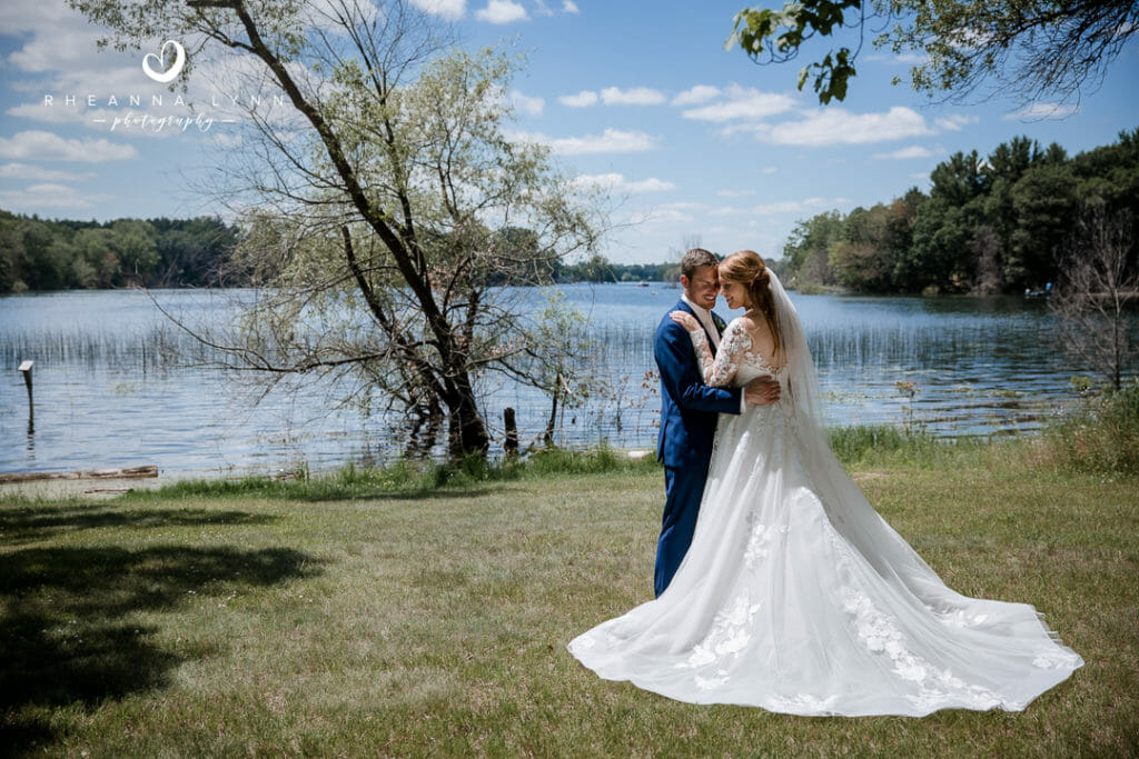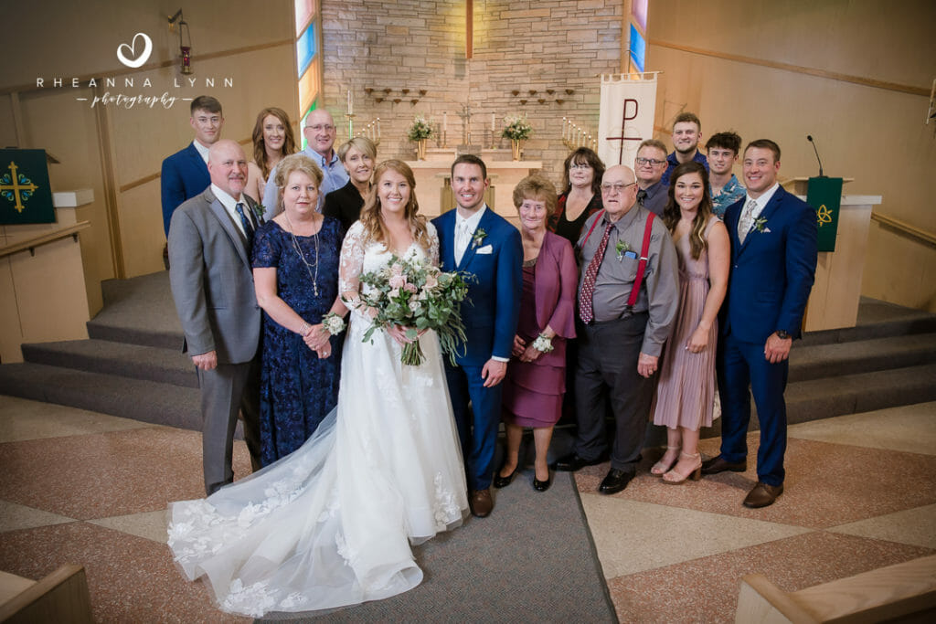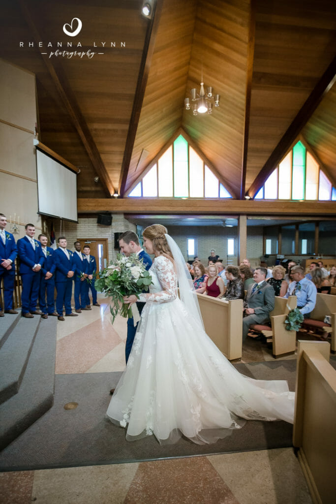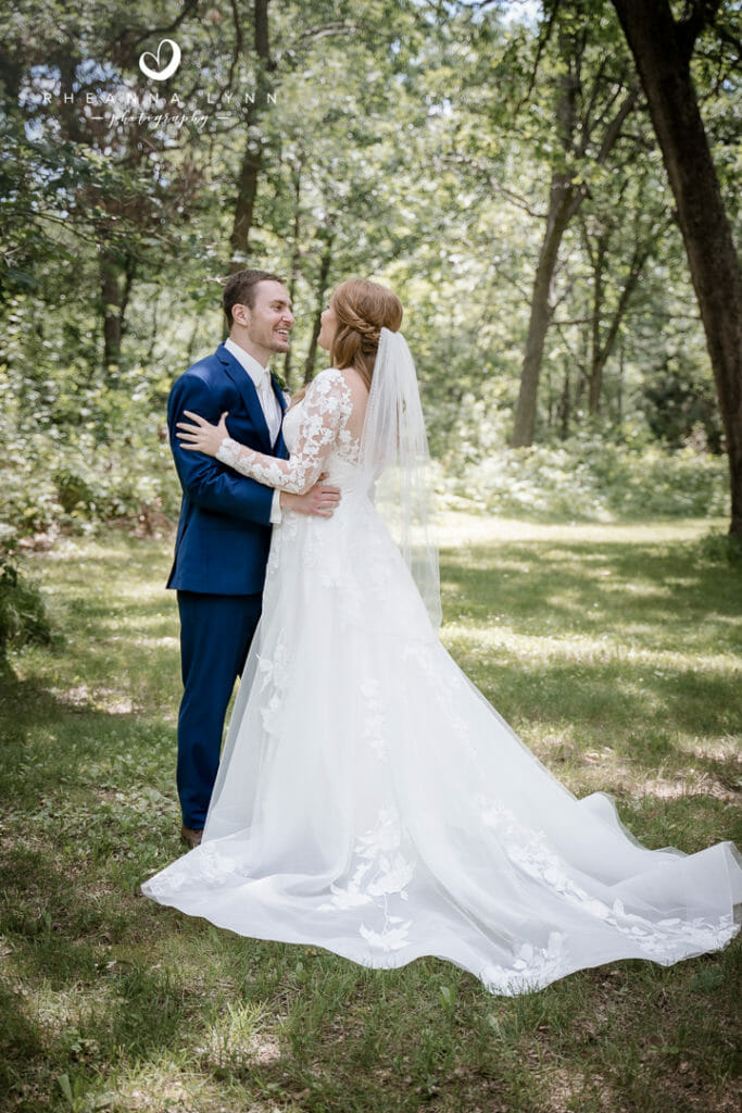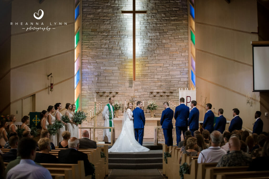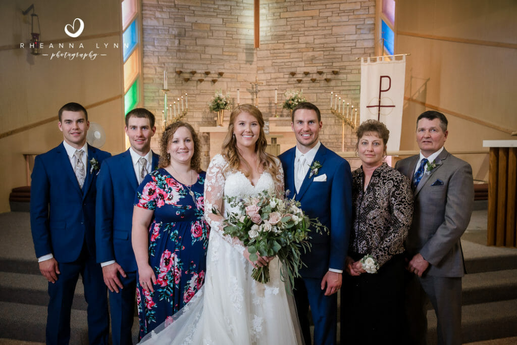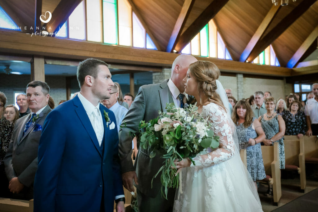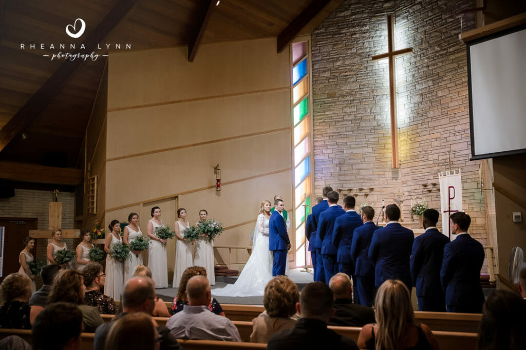 Logan and Karina opted to share an intimate first look before their ceremony. We went out to Lake Emily for a beautiful forested backdrop and pristine lake. They shared a lovely and intimate moment together, a sweet and romantic bridal session, before inviting the bridal party off of the bus for some fun photos. We stopped by the lake for a few quick photos (these are some of my absolute faves- look at Karina in her gown!!!) before heading out over rolling hills and farm fields to their church in Manawa.