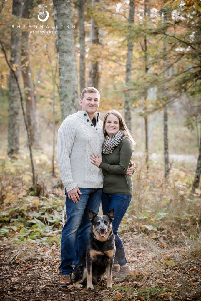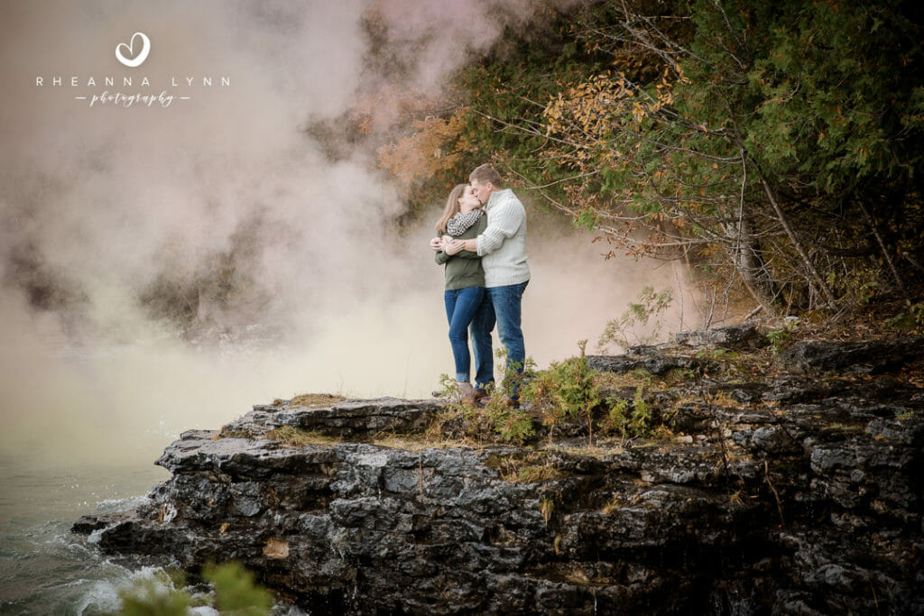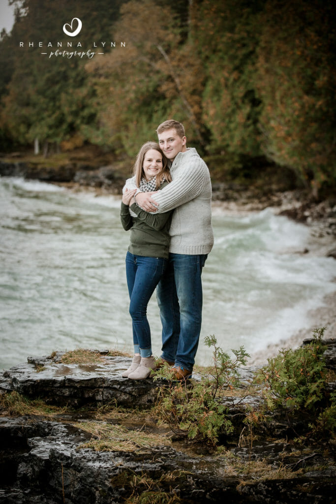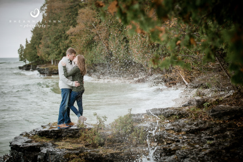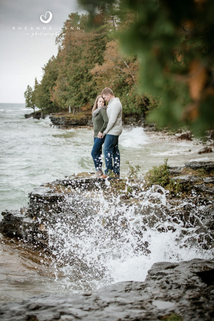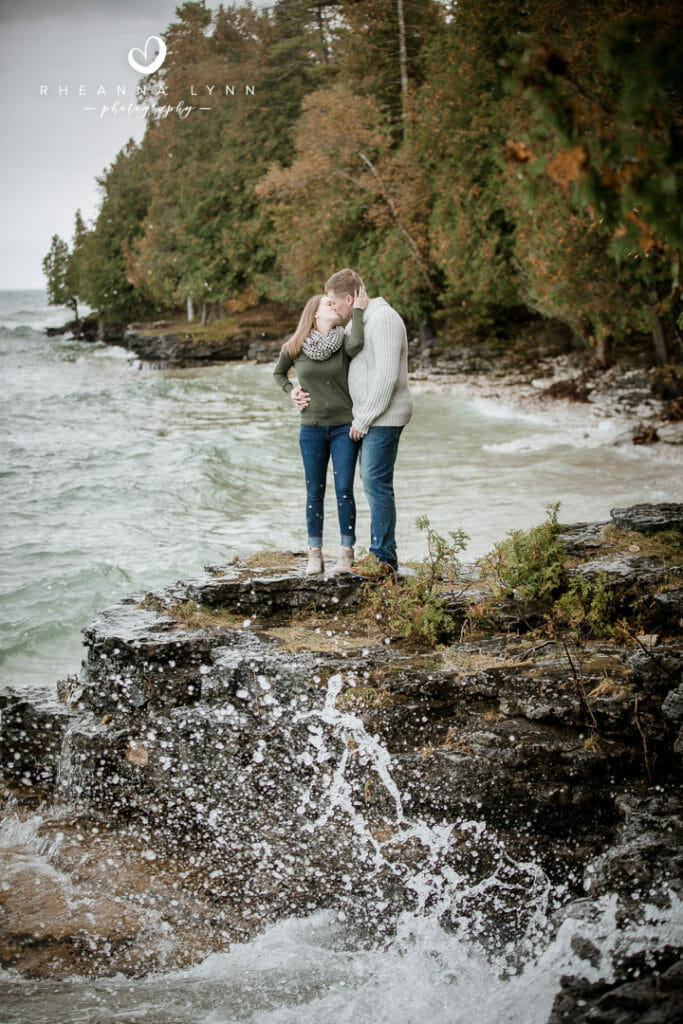 Once we finalized the location- I knew exactly what I wanted to do and could not wait for their session! We started off at Cave Point/Whitefish Dunes and enjoyed the natural beauty the park has to offer, before hiking quite a distance away from all of the other guests to play with the smoke bombs. Once we found the perfect spot and they went off, I couldn’t believe what I was seeing- it was truly phenomenal to see such fun color at such an amazing location! (I should mention to any readers, this is something that needs to be cleared beforehand and we had permission to do so, as well as securing a photo permit all the while being respectful of the environment and park guests. There’s a lot of behind-the-scenes work that goes into planning a session like this which was all taken care of before the session.) We hiked through the park finding remote areas, chatting over wedding day plans, and enjoying Mr. Oscar (their sweet fur baby).