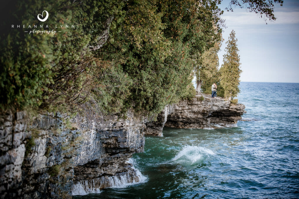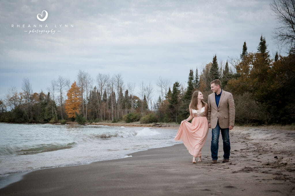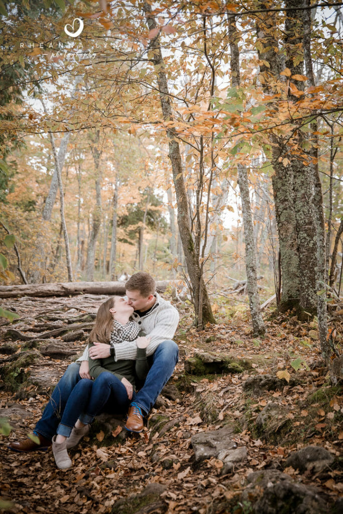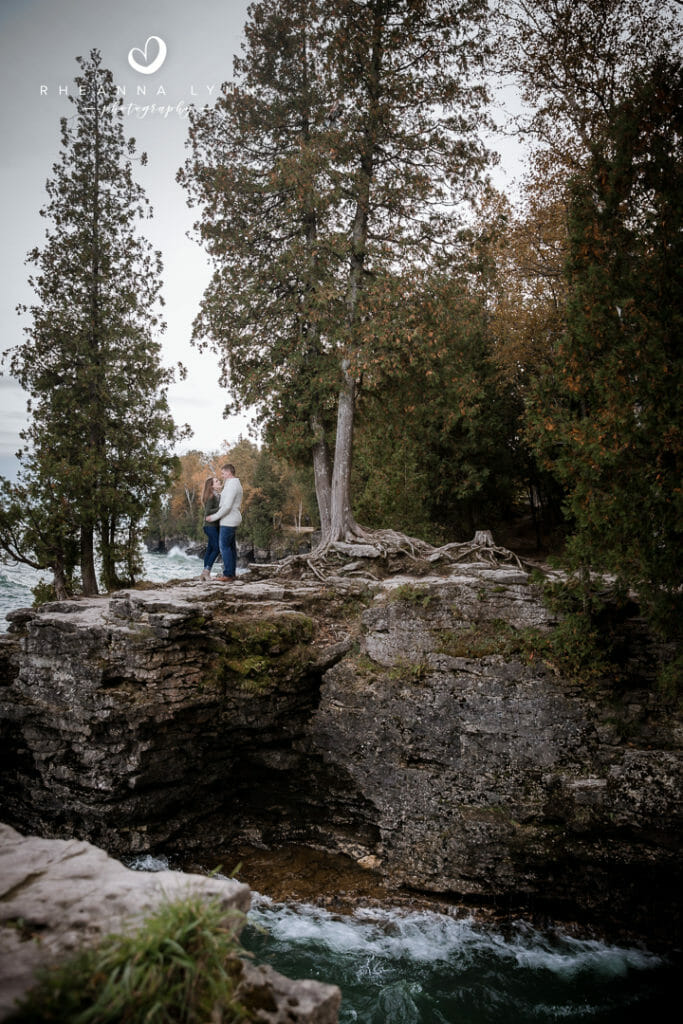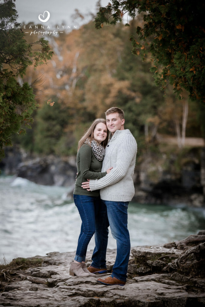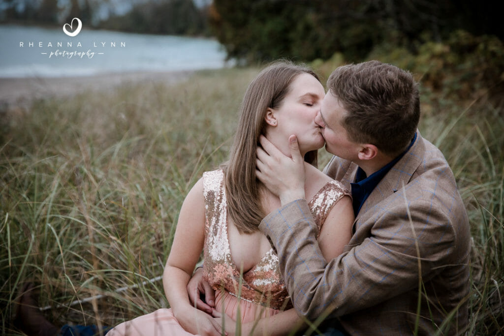 Once we finalized the location- I knew exactly what I wanted to do and could not wait for their session! We started off at Cave Point/Whitefish Dunes and enjoyed the natural beauty the park has to offer, before hiking quite a distance away from all of the other guests to play with the smoke bombs. Once we found the perfect spot and they went off, I couldn’t believe what I was seeing- it was truly phenomenal to see such fun color at such an amazing location! (I should mention to any readers, this is something that needs to be cleared beforehand and we had permission to do so, as well as securing a photo permit all the while being respectful of the environment and park guests. There’s a lot of behind-the-scenes work that goes into planning a session like this which was all taken care of before the session.) We hiked through the park finding remote areas, chatting over wedding day plans, and enjoying Mr. Oscar (their sweet fur baby).